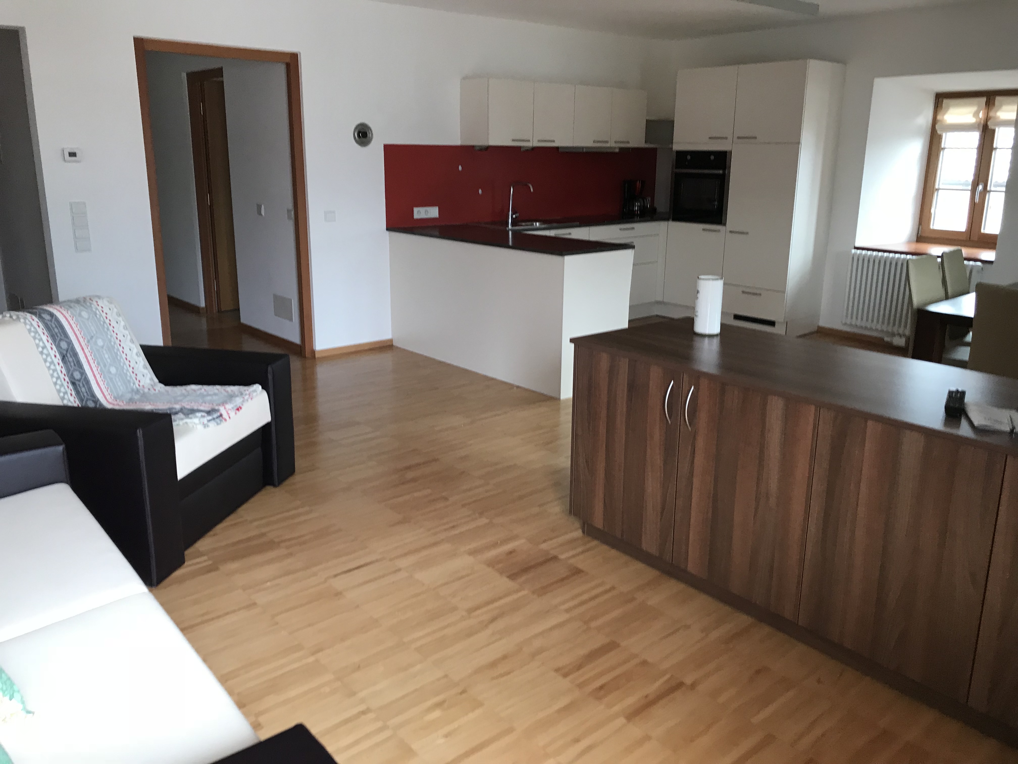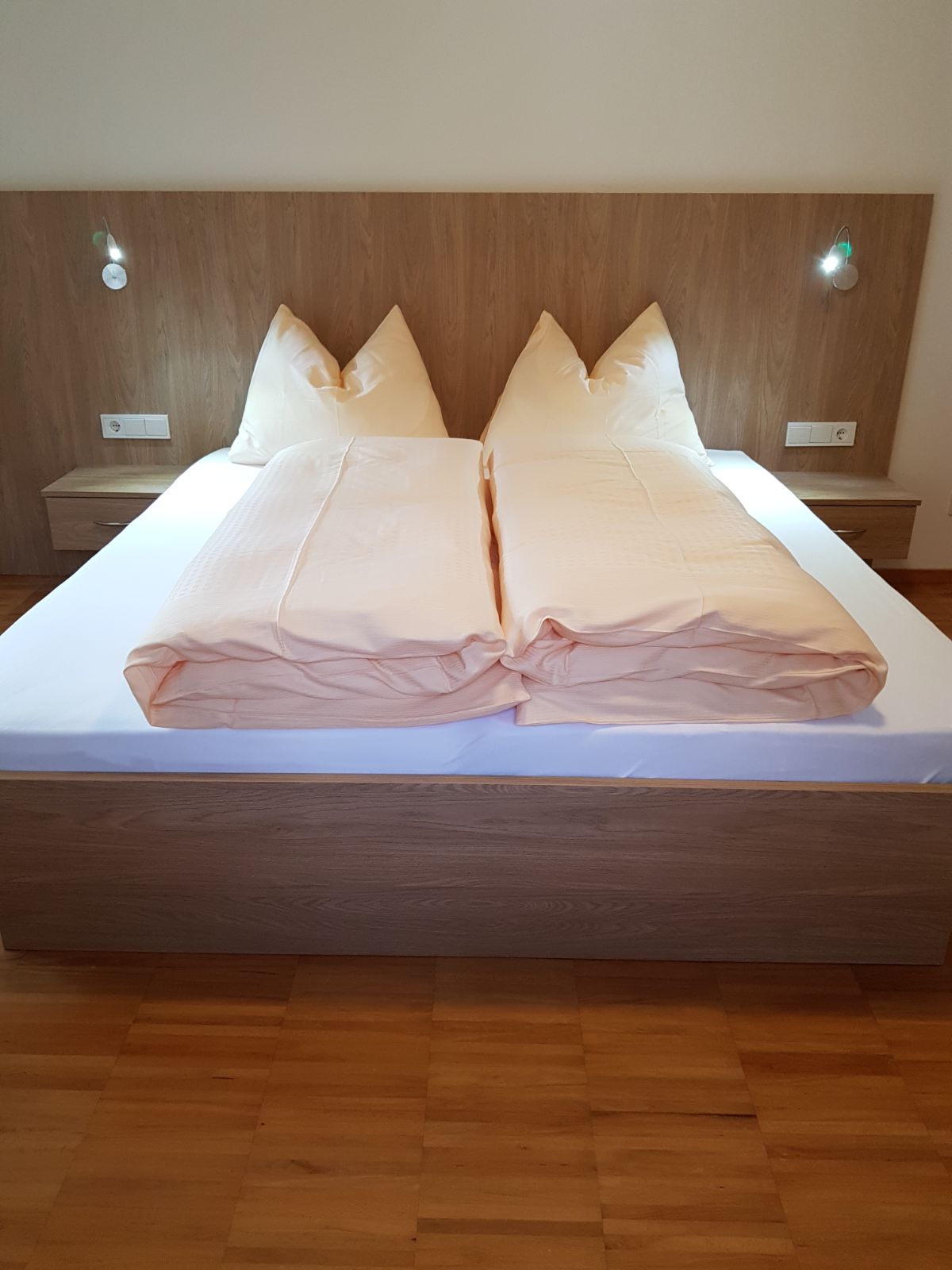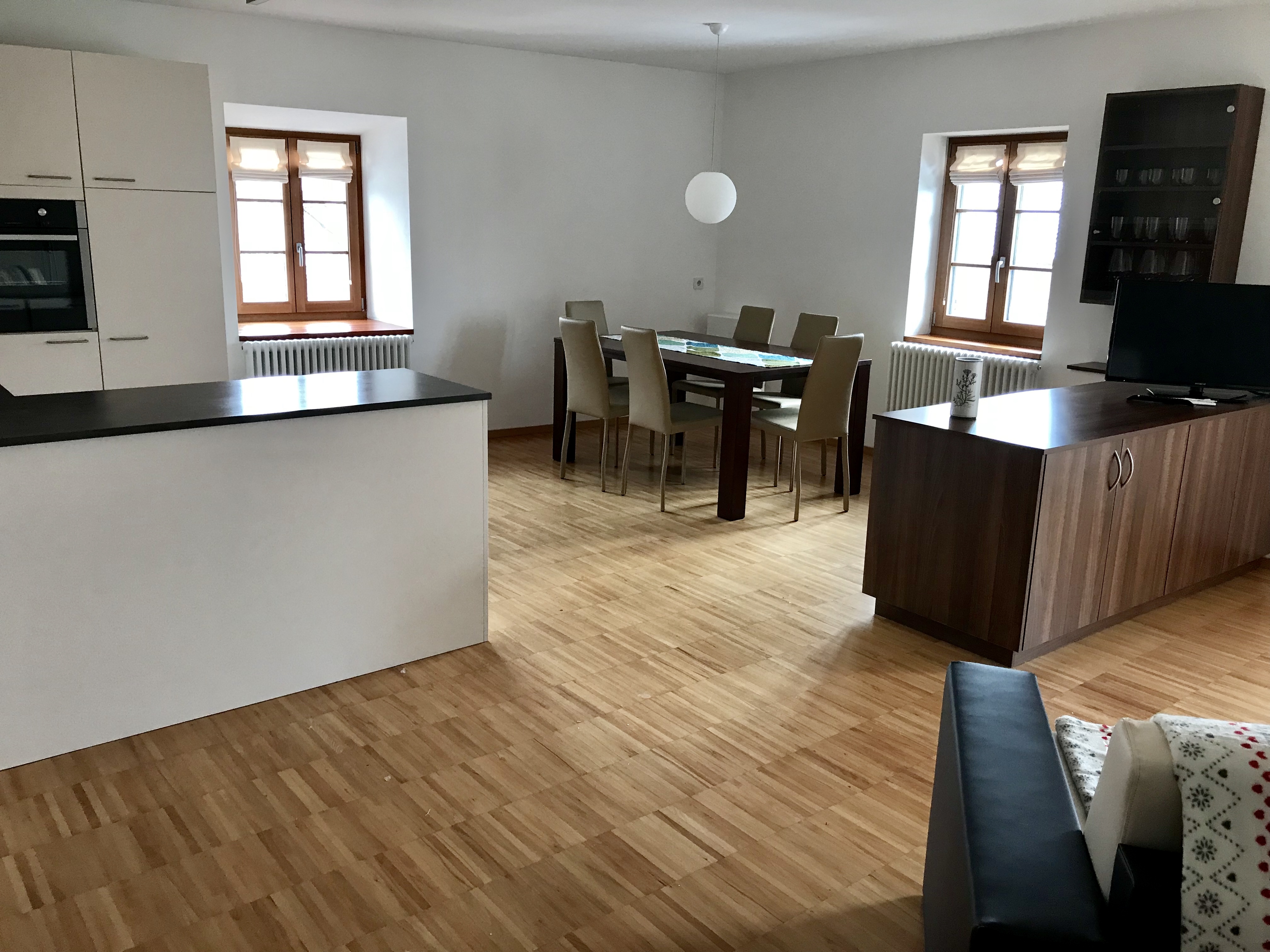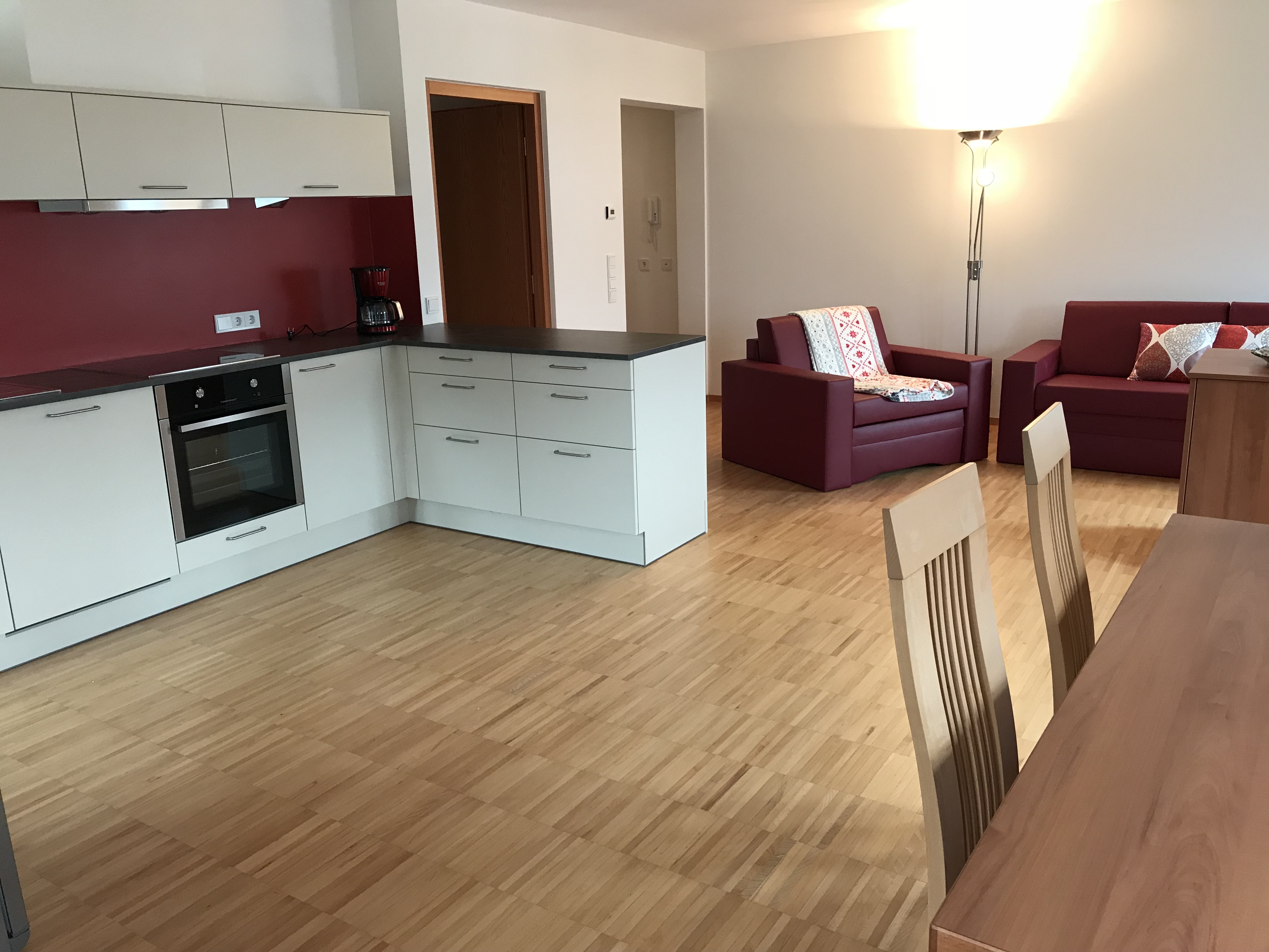 2 getrennte Schlafzimmer davon ein Doppelzimmer und ein Zimmer mit 2 Einzelbetten, sowie eine im Wohnraum gelegene Schlafcouch stehen unseren Gästen zur Verfügung.Zzudem verfügt die Wohnung über einen kleinen Balkon und einem Holzboden in jedem Raum. Weiters verfügt die Wohnung über einen Safe, eine Wohnküche, Kaffeemaschine, Geschirrspülmaschine, Waschmaschine und einen Elektroherd. Das Geschirr sowie Bettwäsche und Handtücher stehen Ihnen frei zur Verfügung. Des weiteren haben sie eine Dusche/Bad mit Bidet einen TV sowie WLAN und einen herrlichen Panoramablick. Zudem verfügt jede Wohnung über einen abschließbaren Abstellraum für Fahrräder, Ski usw.
