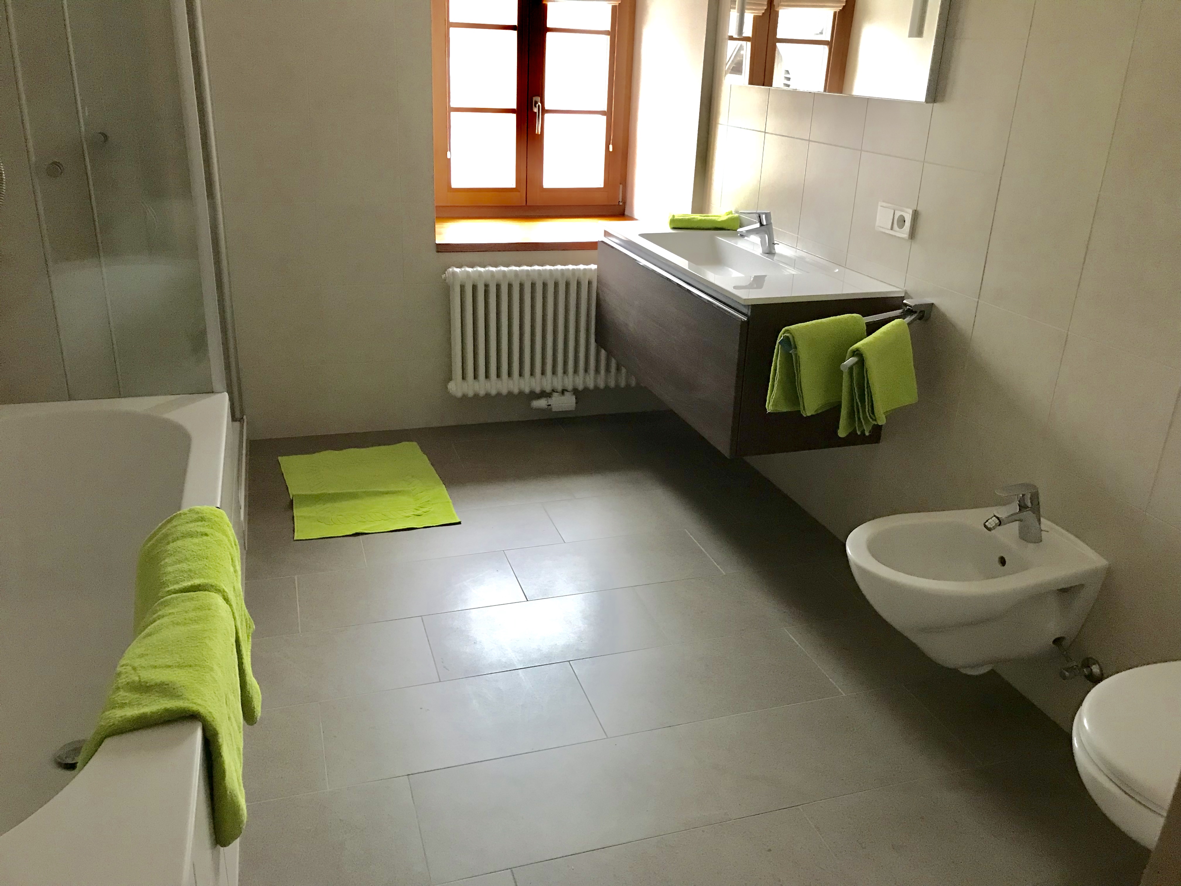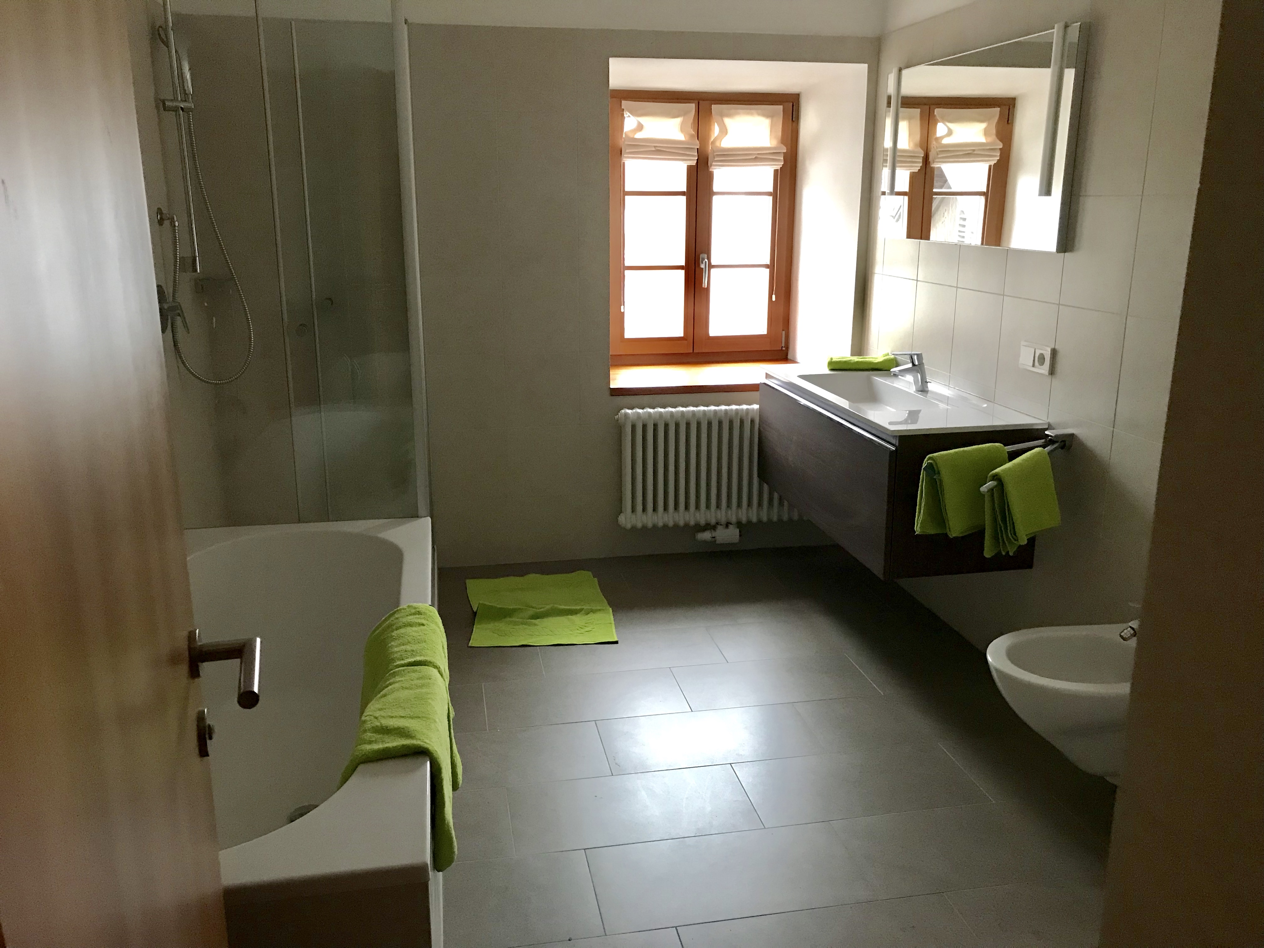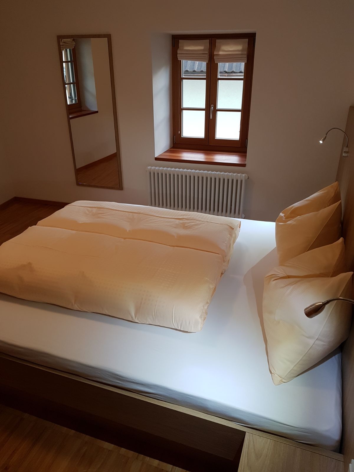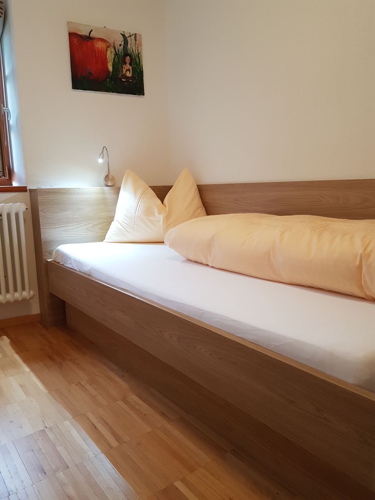 2 getrennte Schlafzimmer davon ein Doppelzimmer und ein Zimmer mit 2 Einzelbetten, sowie eine im Wohnraum gelegene Schlafcouch stehen unseren Gästen zur Verfügung.Zzudem verfügt die Wohnung über einen kleinen Balkon und einem Holzboden in jedem Raum. Weiters verfügt die Wohnung über einen Safe, eine Wohnküche, Kaffeemaschine, Geschirrspülmaschine, Waschmaschine und einen Elektroherd. Das Geschirr sowie Bettwäsche und Handtücher stehen Ihnen frei zur Verfügung. Des weiteren haben sie eine Dusche/Bad mit Bidet einen TV sowie WLAN und einen herrlichen Panoramablick. Zudem verfügt jede Wohnung über einen abschließbaren Abstellraum für Fahrräder, Ski usw.
